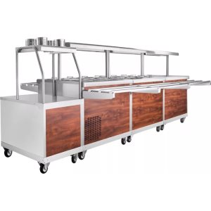 Над столешницей предусмотрена удобная полка, на которую можно выставить десерты, выпечку, бутерброды или другие готовые блюда. Для более комфортного и безопасного обслуживания в комплект входят складные направляющие для подносов, которые при необходимости легко убираются, освобождая пространство. Рабочая зона освещается встроенной светодиодной лампой мощностью 12 Вт, что обеспечивает хорошую видимость при любом уровне освещения в помещении.
