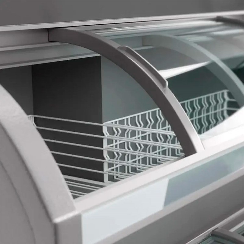 • Раздвижные двери с изогнутым стеклом: Двери выполнены из закаленного теплоотражающего стекла. Специальное покрытие стекла способствует экономии энергии, минимизируя теплопотери. Изогнутая форма стекла не только улучшает эстетику, но и облегчает доступ к продуктам.