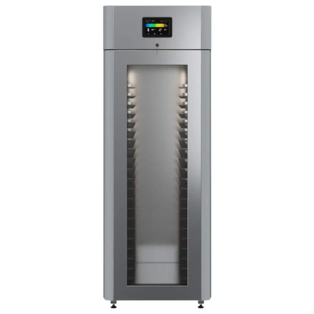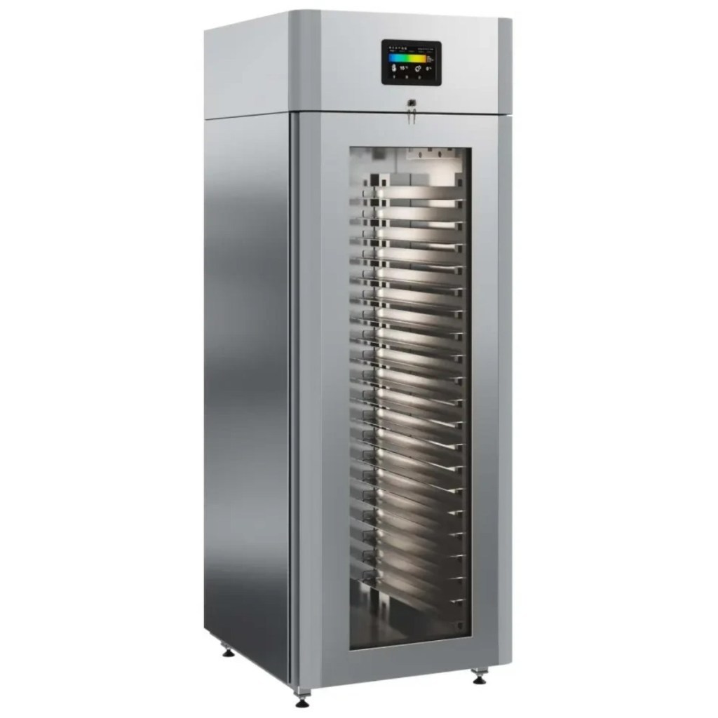 Каталог оборудования Холодильное оборудованиеШкафы холодильныеСпециализированные холодильные шкафыШкаф холодильный для хлебопекарных производств Polair CS107-Bakery Br со стеклом (Тип 1) Шкаф холодильный для хлебопекарных производств Polair CS107-Bakery Br со стеклом (Тип 1) Код товара: 062-622 Поделиться: WhatsAppTelegram СравнитьДобавить в КПВ избранное 0 414 545 ₽ В корзину 0 шт Под заказСамовывоз сегодня бесплатно Взять в кредит Купить в лизинг Получить консультацию в WhatsApp Описание Характеристики Отзывы 0 Инструкции 5 Шкаф холодильный для хлебопекарных производств Polair CS107-Bakery Br со стеклом (Тип 1) предназначен для создания оптимальных условий хранения и расстойки заготовок из теста на предприятиях общественного питания и торговли. Цельнозаливной корпус выполнен из нержавеющей стали, дверь — стеклопакет. Оборудование стабильно работает при температуре окружающей среды до +40 °C. В комплект входят 20 пар направляющих размером 400×600 мм. Особенности: Широкий функционал: охлаждение, замедление ферментации, хранение, регенерация, брожение и расстойка Динамическое охлаждение с мягким обдувом без заветривания и автоматическая оттайка с системой испарения конденсата Панель управления с 5" дисплеем: контроль температуры, влажности (регулируется от 60 до 95 %), скорости вентилятора и времени, а также возможность создания и сохранения программ Встроенный ультразвуковой увлажнитель (необходима система водоочистки и канализация) Эргономичная конструкция: верхнее расположение агрегата, распашная дверь со стеклопакетом, механизм самозакрывания, педаль для открытия, съёмные направляющие и легко заменяемый уплотнитель с магнитной вставкой Дополнительная защита: пластиковый бордюр по периметру камеры для предотвращения повреждений от тележек Простота ухода: штампованное углубление в дне корпуса для сбора загрязнений Экологичный хладагент R290 и энергоэффективность: потребляемая мощность — 0,55 кВт (охлаждение), 0,9 кВт (нагрев) Толщина стенки корпуса — 43 мм Polair CS107-Bakery Br со стеклом (Тип 1) — надёжный и многофункциональный шкаф, который обеспечивает полное управление процессами брожения и расстойки теста. Современная система охлаждения и увлажнения, продуманная конструкция и удобное управление делают его оптимальным решением для пекарен и кондитерских, стремящихся к стабильному качеству и высокой производительности.Изображение товара, представленного на фото, может отличаться от его фактического вида. Показать все Габаритные размеры697×1005×1960 ммДиапазон рабочей температурыот -10 до +40 °CДлина697 ммШирина1005 ммВысота1960 ммОбъём700 лКол-во дверей1 Тип двериСтеклянная Уровень влажностиот 60 до 95 %Направляющие под EN 40*6020 Расстояние между направляющими60 ммХолодильный агрегатВстроенный Тип оттайкиАвтоматическая Тип охлажденияДинамический ПодсветкаЕсть ХладагентR290 Вес нетто180 кгБрендPolairВсе специализированные холодильные шкафы Из нержавейки Оставить отзыв Еще никто не оставил отзыв на этот товар Схема POLAIR CS107 Bakery Br.jpgИнструкция на POLAIR CS107 Bakery Br.pdfБрошюра на хлебопекарное оборудование POLAIR.pdfДекларация о соответствии.pdfСертификат соответствия.pdf Похожие товары Перейти в каталог Под заказ 118 831 ₽ Шкаф холодильный HURAKAN HKN-MA100 для созревания мяса В наличии 405 365 ₽ Шкаф холодильный для хлебопекарных производств Polair CS107 Bakery Br черный, со стеклом (Тип 2) Под заказ 390 915 ₽ Шкаф холоди