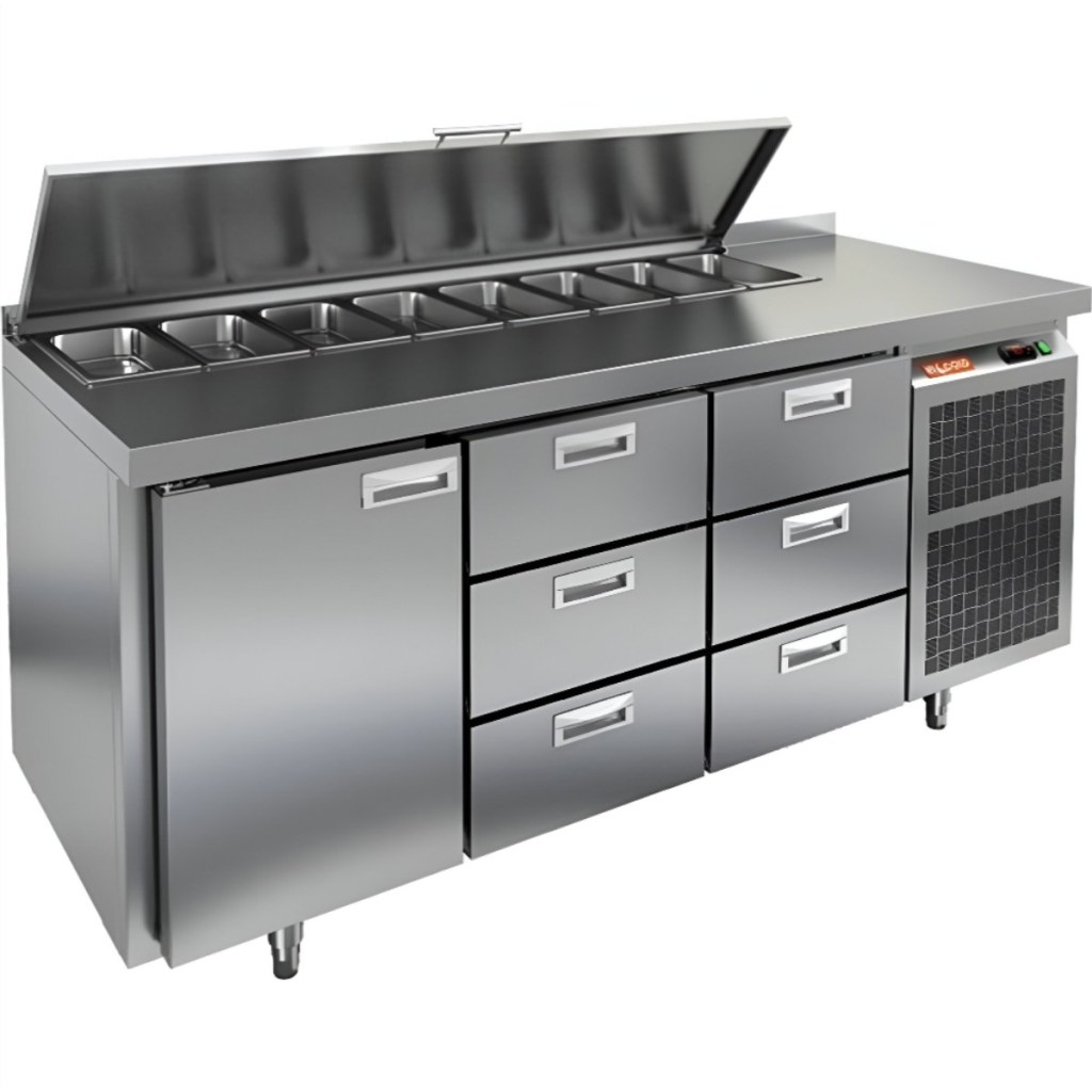 Каталог оборудования Холодильное оборудованиеСтолы охлаждаемыеСтолы холодильные для салатовСтол холодильный для салатов HiCold SL1-133GN (1/3) с крышкой Стол холодильный для салатов HiCold SL1-133GN (1/3) с крышкой Код товара: 064-848 Поделиться: WhatsAppTelegram СравнитьДобавить в КПВ избранное 0 209 962 ₽ В корзину 0 шт Под заказСамовывоз сегодня бесплатно Взять в кредит Купить в лизинг Получить консультацию в WhatsApp Описание Характеристики Отзывы 0 Стол холодильный для салатов HiCold SL1-133GN (1/3) предназначен для использования на предприятиях общественного питания и торговли. Он объединяет рабочую поверхность и охлаждаемый отсек, что делает его удобным решением для хранения, охлаждения и подготовки ингредиентов при приготовлении салатов, пиццы и других блюд. Такая конструкция позволяет повару работать быстрее и эффективнее, так как все необходимые продукты находятся под рукой. Корпус и столешница выполнены из прочной нержавеющей стали, устойчивой к коррозии и легко поддающейся санитарной обработке. Металлическая крышка защищает продукты от загрязнений и сохраняет их свежесть. Особенности модели: Электронная панель управления — точная настройка температурного режима. 1 глухая дверь — удобный доступ к холодильному отсеку. 6 выдвижных ящика — быстрое размещение и замена продуктов. Вместимость салат-бара — до 8 гастроемкостей глубиной до 100 мм. Автоматические доводчики дверей с фиксацией в открытом положении. Легкозаменяемые магнитные уплотнители — надежная герметичность. Открытая агрегатная часть — быстрый доступ для обслуживания. Регулируемые по высоте ножки — устойчивость даже на неровном полу. Толщина столешницы, борта и теплоизоляции — 50 мм, что обеспечивает прочность и энергоэффективность конструкции. HiCold SL1-133GN (1/3) — практичное и удобное решение для профессиональной кухни, обеспечивающее удобную подготовку и хранение ингредиентов. Изображение товара, представленного на фото, может отличаться от его фактического вида. Показать все Габаритные размеры1835×700×850 ммДиапазон рабочей температурыот +2 до +10 °CРасположение агрегатаБоковое Материал столешницыНержавеющая Тип столаС дверьми и ящиками Тип двериГлухая Объём505 лКоличество дверей1 штТип гастроемкостейGN 1/3 Количество ящиков6 штРазмер полки530×325 ммНапряжение220 ВМощность0,46 кВтТип охлажденияДинамическое Тип оттайкиАвтоматическая СтолешницаС бортом Габариты в упаковке2000×850×1000 ммВес нетто130 кгВес брутто185 кгБрендHicold Оставить отзыв Еще никто не оставил отзыв на этот товар Ранее просмотрено Под заказ 305 992 ₽ Стол холодильный для салатов HiCold SL1-333GN (1/3) с крышкой
